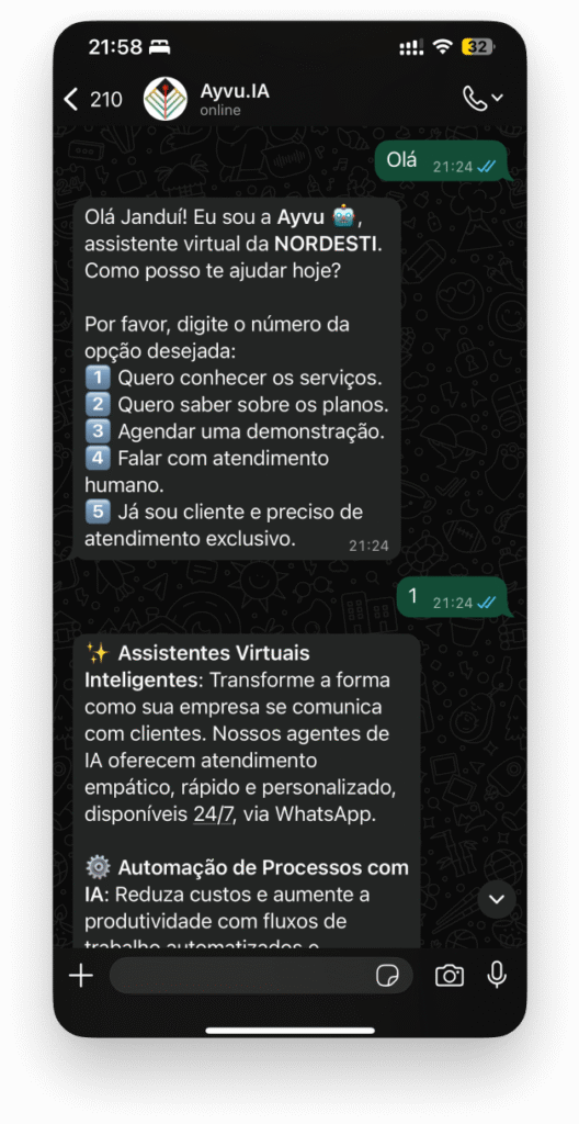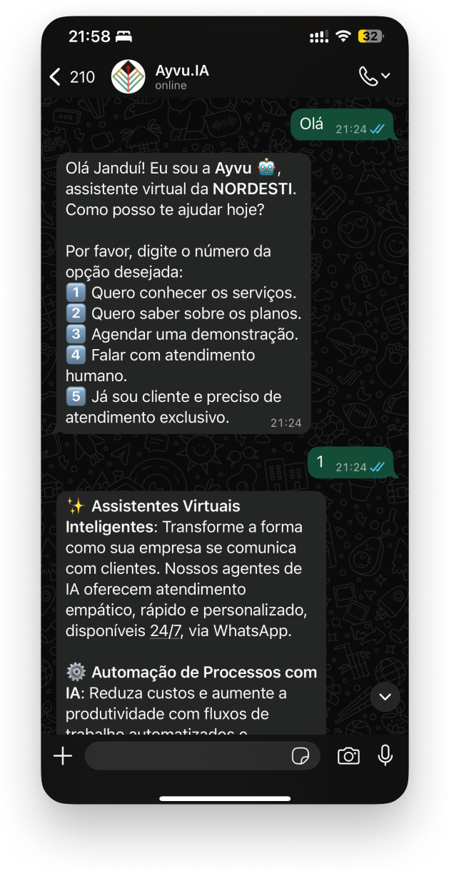 Usar o Ayvu.IA transformou a forma como eu atendo meus clientes pelo WhatsApp. O assistente entende o tom da minha marca, responde com empatia e mantém o mesmo cuidado que eu teria em cada conversa. Hoje eu consigo estar presente no que realmente importa, enquanto o Ayvu cuida do primeiro contato, organiza as informações e conduz o atendimento com leveza e agilidade. 💙 É como ter alguém da minha própria equipe sempre disponível, falando com o meu jeito, com a minha voz e com o mesmo propósito: oferecer uma experiência acolhedora e humana para quem chega até mim.